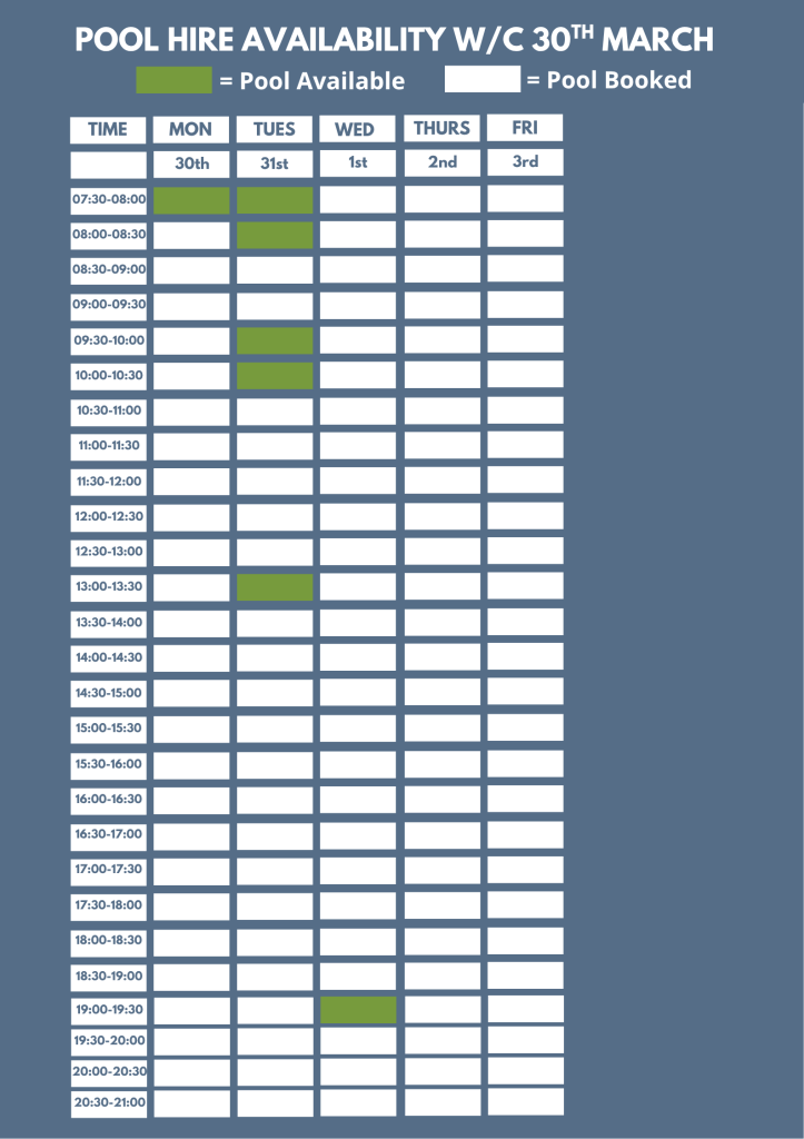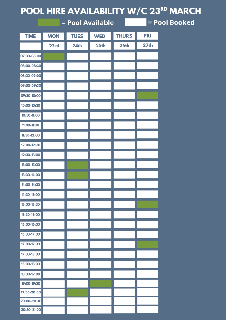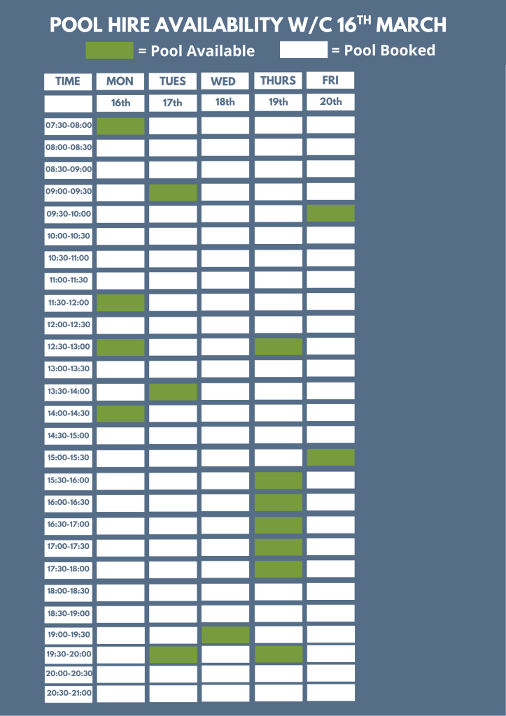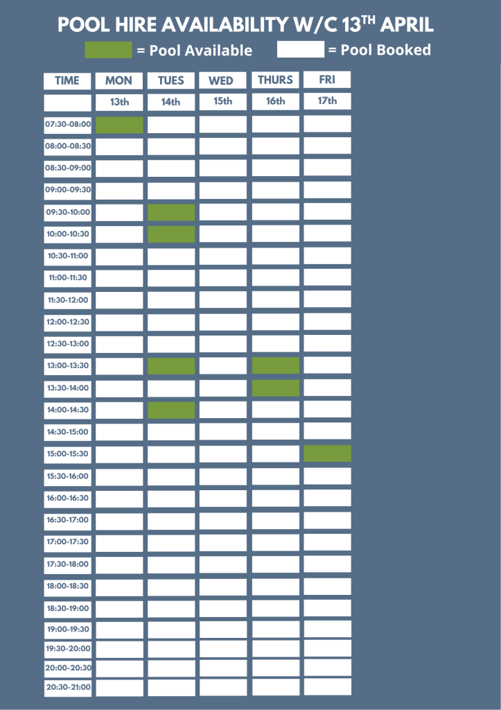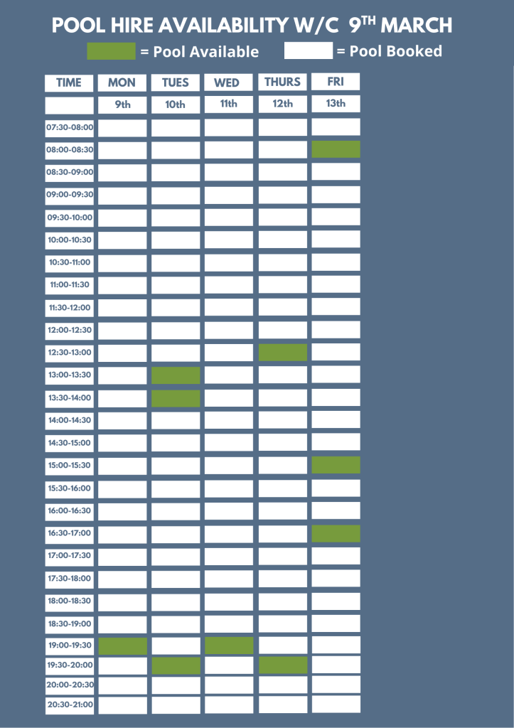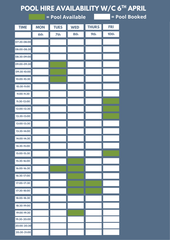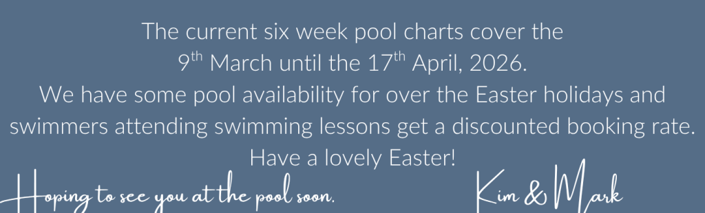 Our current six week block booking period is from the 9th March, 2026 until 17th April,2026. Should you wish to start block booking at the pool part way through a six week block, the booking rate will be adjusted accordingly.